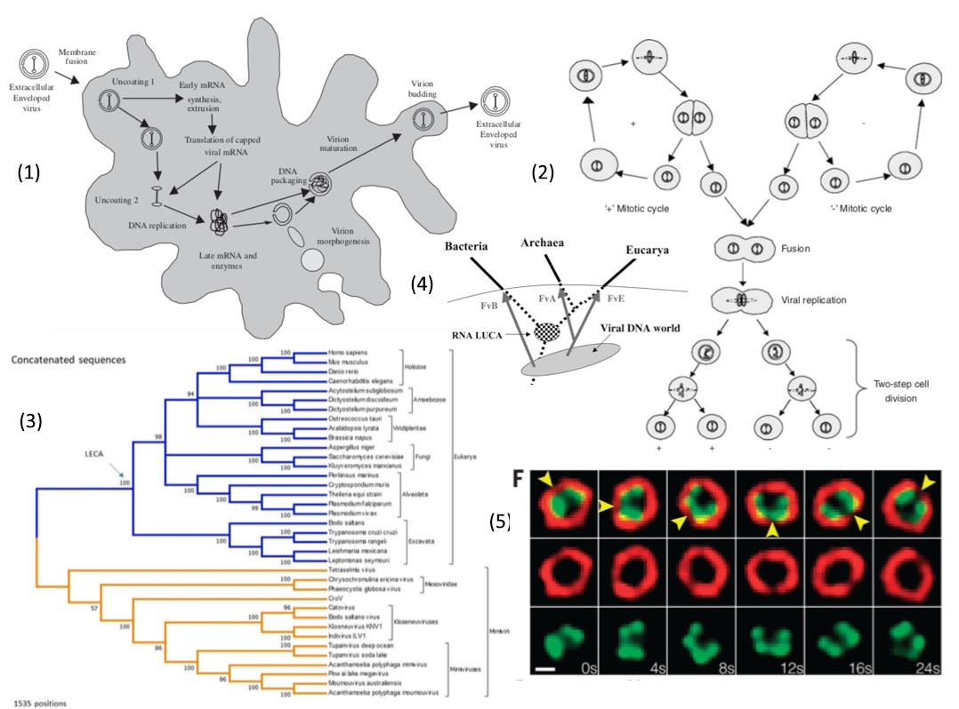 Offset against both the uniqueness of the mitochondrial endo-symbiosis and the closely linked, but independent question of the origin of the nucleus and nuclear envelope, has been the discovery of giant mimi-, mama-, mega- and pandora-viruses infecting amoeba (Raoult et, al., Philippe et al) and related very large aquatic viruses such as CroV infecting single celled plankton species (Fisher et. al.), which despite their recent discovery, appear from ocean gene analyses to be potentially ubiquitous and widespread in the oceans and possibly playing a crucial role in regulating the atmospheric-oceanic pathways, such as carbon sequestration.
