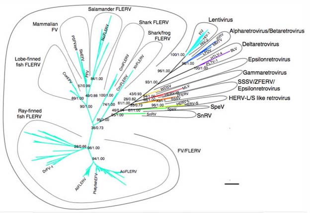 Moreover although viral genomes are harder to place in a single evolutionary tree due to extensive horizontal transfer of genes, including transfers between the three domains of cellular life as well as among viral elements, research is beginning to elucidate an evolutionary history of the extant viruses that parallels the evolutionary tree of cellular life, leading to the concept of Virusworld (Koonin and Dolja 2014). This world spand a fundamental variety of replications types from single and double-stranded RNA viruses, through retroviruses which use reverse transcriptase to generate a double stranded DNA cope from RNA through to single and double-stranded DNA viruses Many of these form capsids, or spread and enter cells by membrane budding and they also include genetic elements that reside within cells such as DNA transposons, retroelements, LTR elements and antibioti resistance and sexual conjugation pasmidsin bacteria as well as syringe-like bacteriophages Mny of these viral grouping can be traced back to the earliest phases of genetic evolution and so have coexisted with evolving cellular genomes upon which cellular life also despite resisting viral infection has depended on for advantageous mutational innovation.